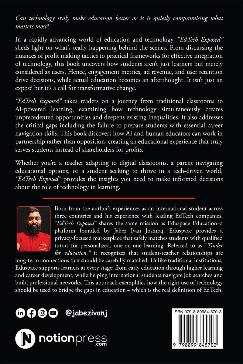"EdTech Exposed" takes readers on a journey from traditional classrooms to AI-powered learning, examining how technology simultaneously creates unprecedented opportunities and deepens existing inequalities. It also addresses the critical gaps including the failure to prepare students with essential career navigation skills. This book discovers how AI and human educators can work in partnership rather than opposition, creating an educational experience that truly serves students instead of shareholders for profits.