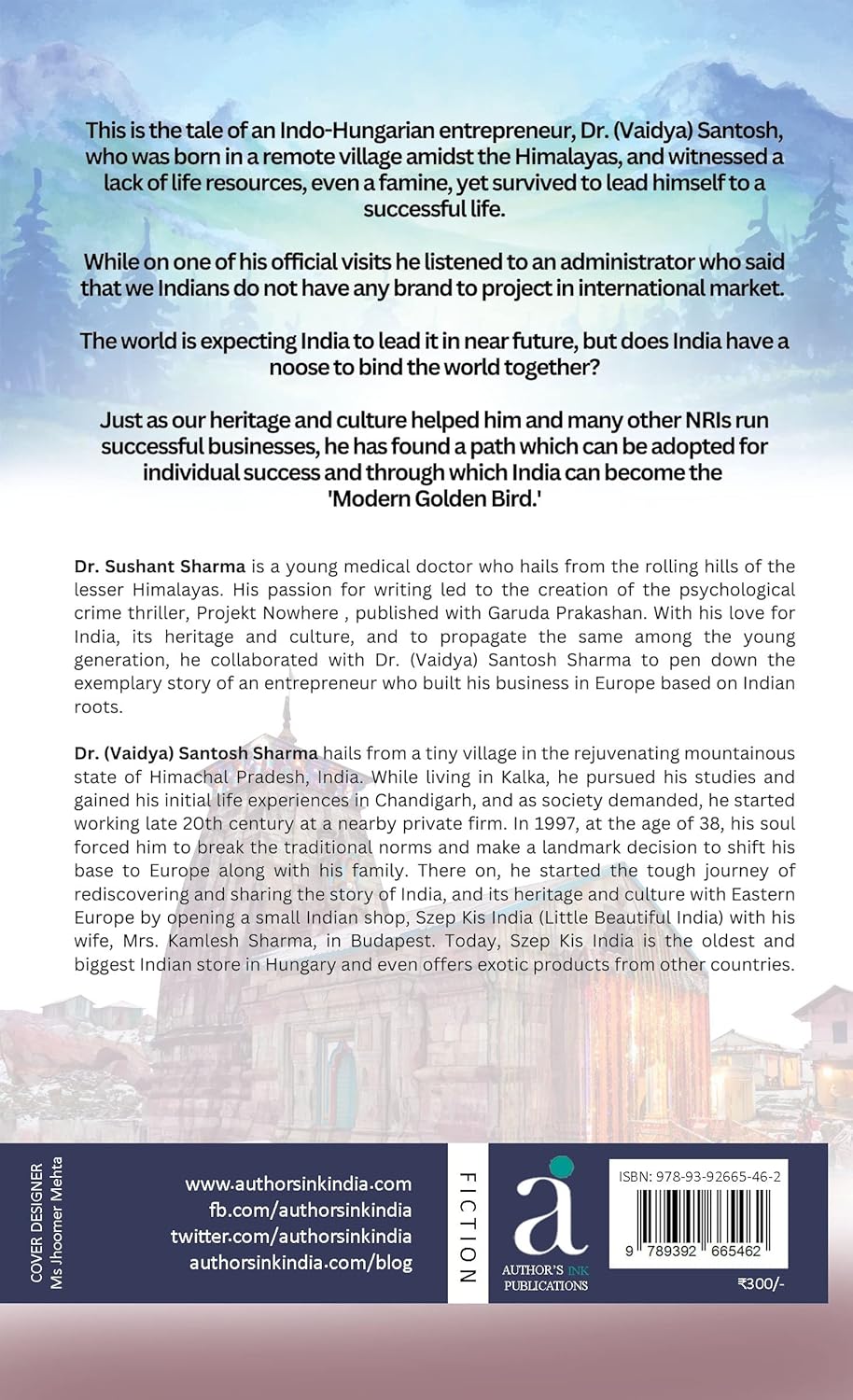 The world is expecting India to lead it in near future, but does India have a noose to bind the world together? Just as our heritage and culture helped him and many other NRIs run successful businesses, he has found a path which can be adopted for individual success and through which India can become the ‘Modern Golden Bird.' Dr. (Vaidya) Santosh Sharma hails from a tiny village in the rejuvenating mountainous state of Himachal Pradesh, India. While living in Kalka, he pursued his studies and gained his initial life experiences in Chandigarh, and as society demanded, he started working late 20th century at a nearby private firm. In 1997, at the age of 38, his soul forced him to break the traditional norms and make a landmark decision to shift his base to Europe along with his family. There on, he started the tough journey of rediscovering and sharing the story of India, and its heritage and culture with Eastern Europe by opening a small Indian shop, Szep Kis India (Little Beautiful India) with his wife, Mrs. Kamlesh Sharma, in Budapest. Today, Szep Kis India is the oldest and biggest Indian store in Hungary and even offers exotic products from other countries. Dr. Sushant Sharma is a young medical doctor who hails from the rolling hills of the lesser Himalayas. His passion for writing led to the creation of the psychological crime thriller, Projekt Nowhere , published with Garuda Prakashan. With his love for India, its heritage and culture, and to propagate the same among the young generation, he collaborated with Dr. (Vaidya) Santosh Sharma to pen down the exemplary story of an entrepreneur who built his business in Europe based on Indian roots.