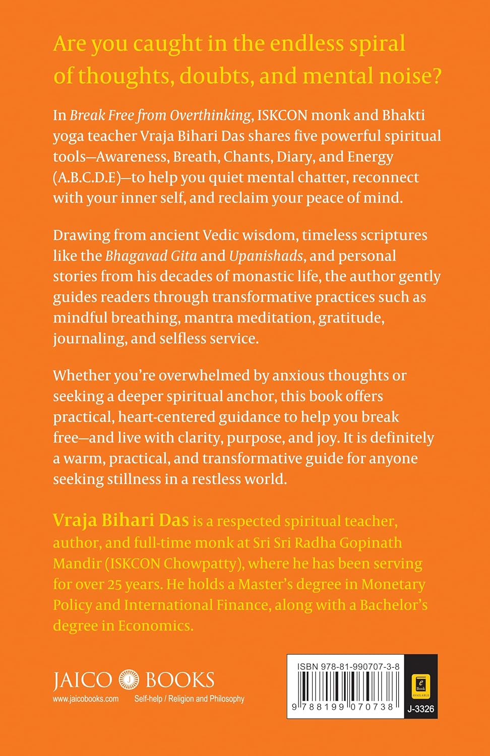In Break Free from Overthinking, ISKCON monk and Bhakti yoga teacher Vraja Bihari Das shares five powerful spiritual tools—Awareness, Breath, Chants, Diary, and Energy (A.B.C.D.E)—to help you quiet mental chatter, reconnect with your inner self, and reclaim your peace of mind.