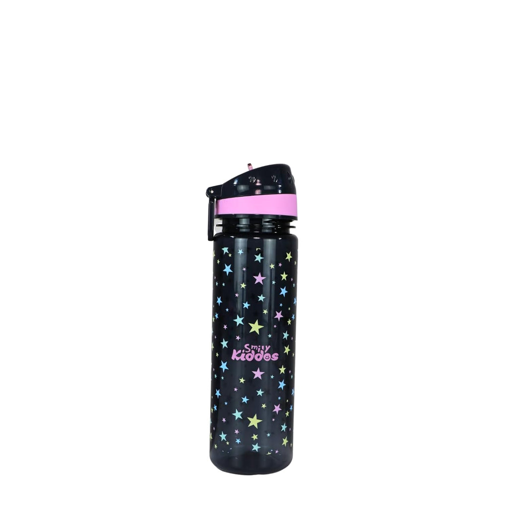 SMILY KIDDOS STRAIGHT WATER BOTTLE WITH FLIP TOP NOZZLE HAPPY STAR THEME BLACK & PINK 680 ML