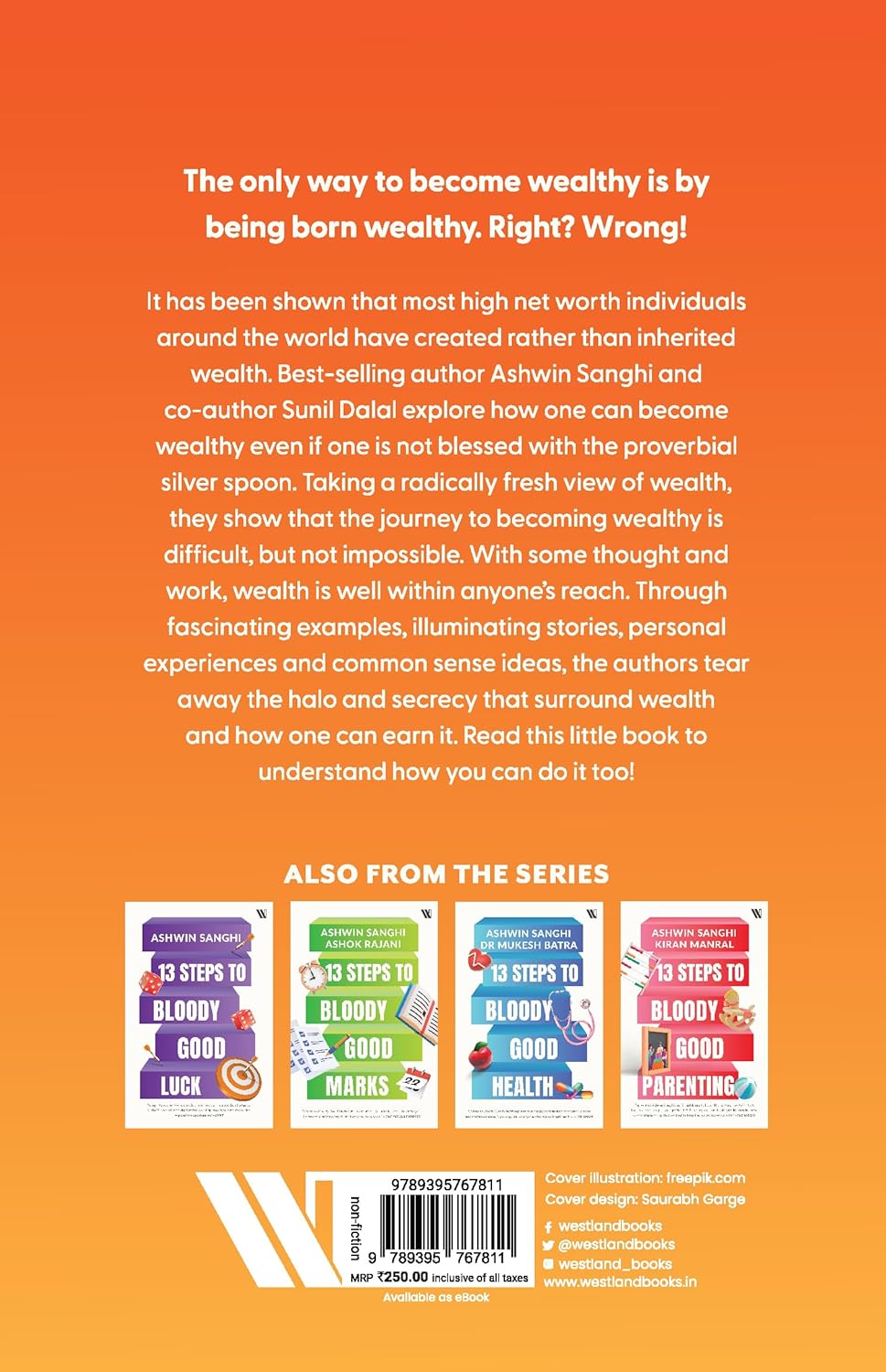 The only way to become wealthy is by being born wealthy. Right? Wrong! In this second book in the 13 Steps series, best-selling author Ashwin Sanghi and co-author Sunil Dalal explore how one can become wealthy even if one is not blessed with the proverbial silver spoon. Taking a radically fresh view of wealth, they show that the journey to becoming wealthy is difficult, but not impossible. With some thought and work, wealth is well within anyone’s reach. The steps presented in 13 Steps to Bloody Good Wealth are easy to implement and do not require anything more than your attention and belief. Through fascinating examples, illuminating stories, personal experiences and common-sense ideas, the authors tear away the halo and secrecy that surrounds wealth and how one can earn it. It has been shown that most high-net-worth individuals around the world have created rather than inherited wealth. Read this little book to understand how you too can do it!