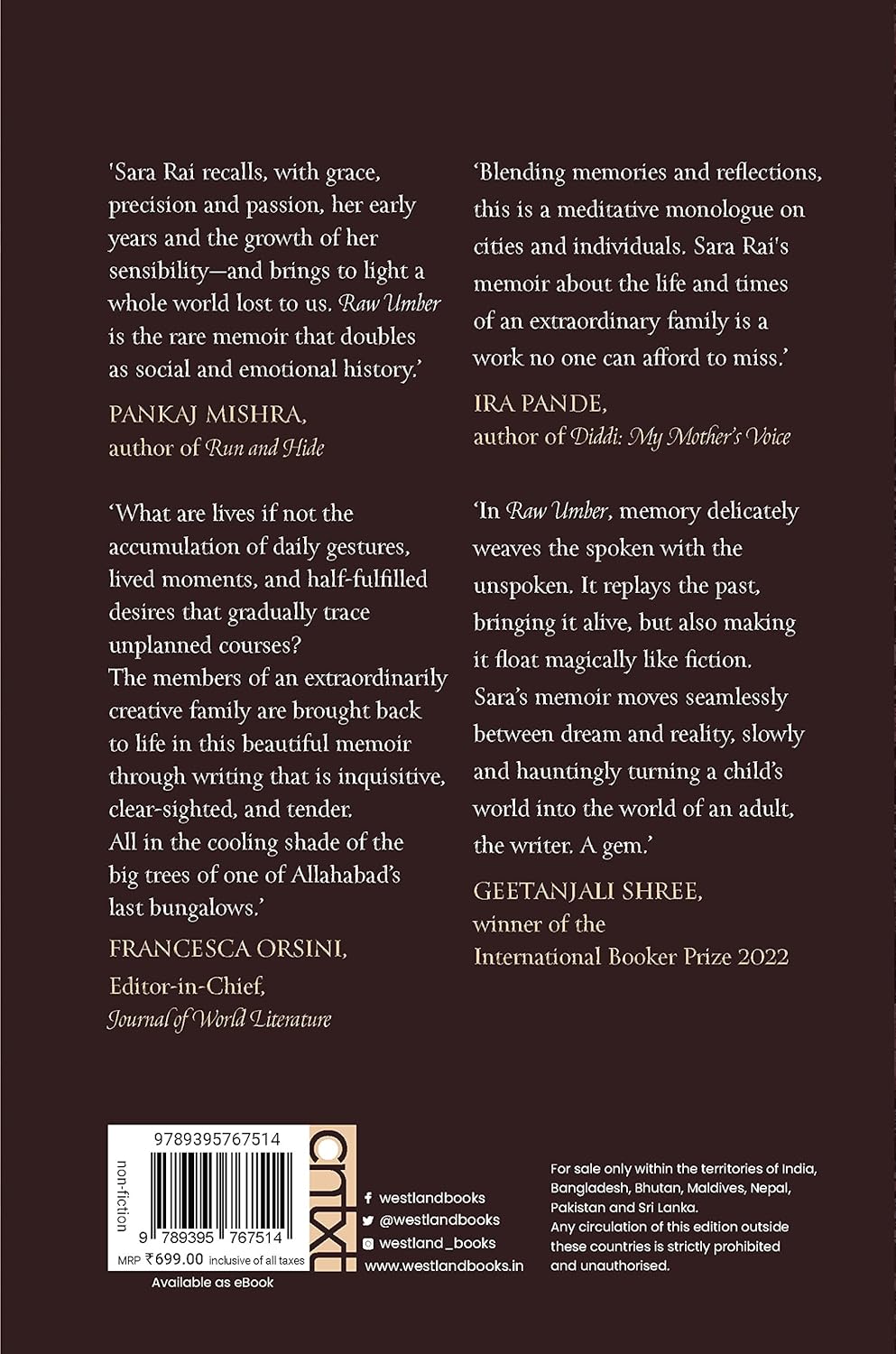 The autobiographical essays in Raw Umber are as much about the steady pulse of Sara Rai’s childhood in the 1960s, as they are about the nature of remembering, and the role that memory plays in shaping a writer’s sensibility. It is the unconscious jottings of the mind, and the cadences that enter the ears, the inner life that develops during years of unhurried living in places like Allahabad and Banaras that prepare the ground for the fiction writer. With the figure of her grandfather Premchand looming over her childhood, and with others in her family—grandmother, parents, aunts, uncles and cousins—also writers, it is hardly a surprise that Sara ‘fell into’ writing. In this literary memoir, some of the characters in the family gallery are brought to life. In chronicling the life and times of one of India’s most illustrious literary families through the prism of her childhood, Sara Rai always keeps to her own remembering of the ever-changing past.